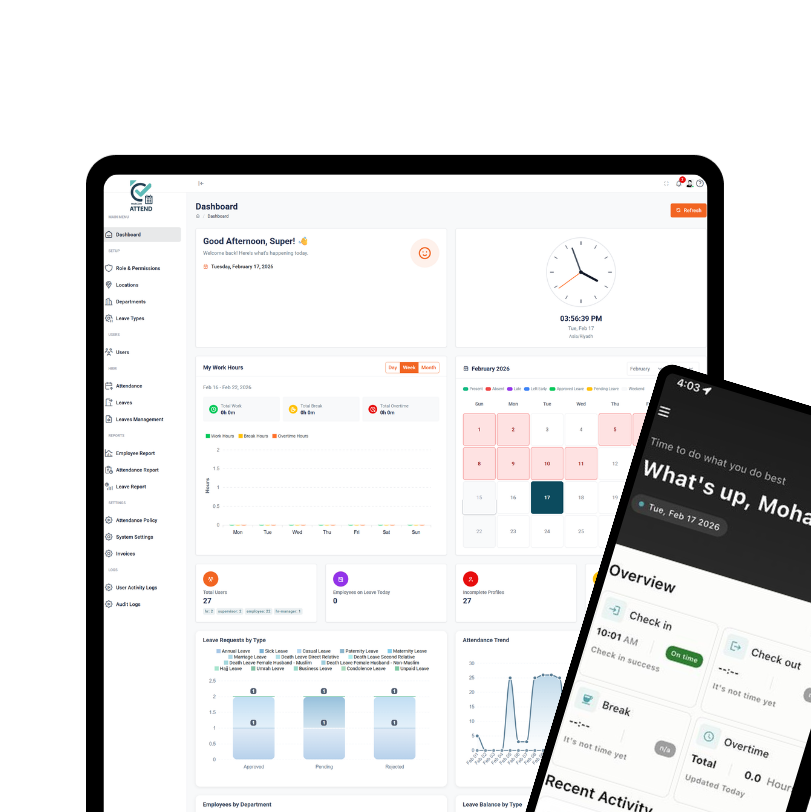 One platform that handles attendance tracking, leave management, policy enforcement, and reporting — automatically, accurately, and in real time. Built for Saudi Arabia and the UAE.